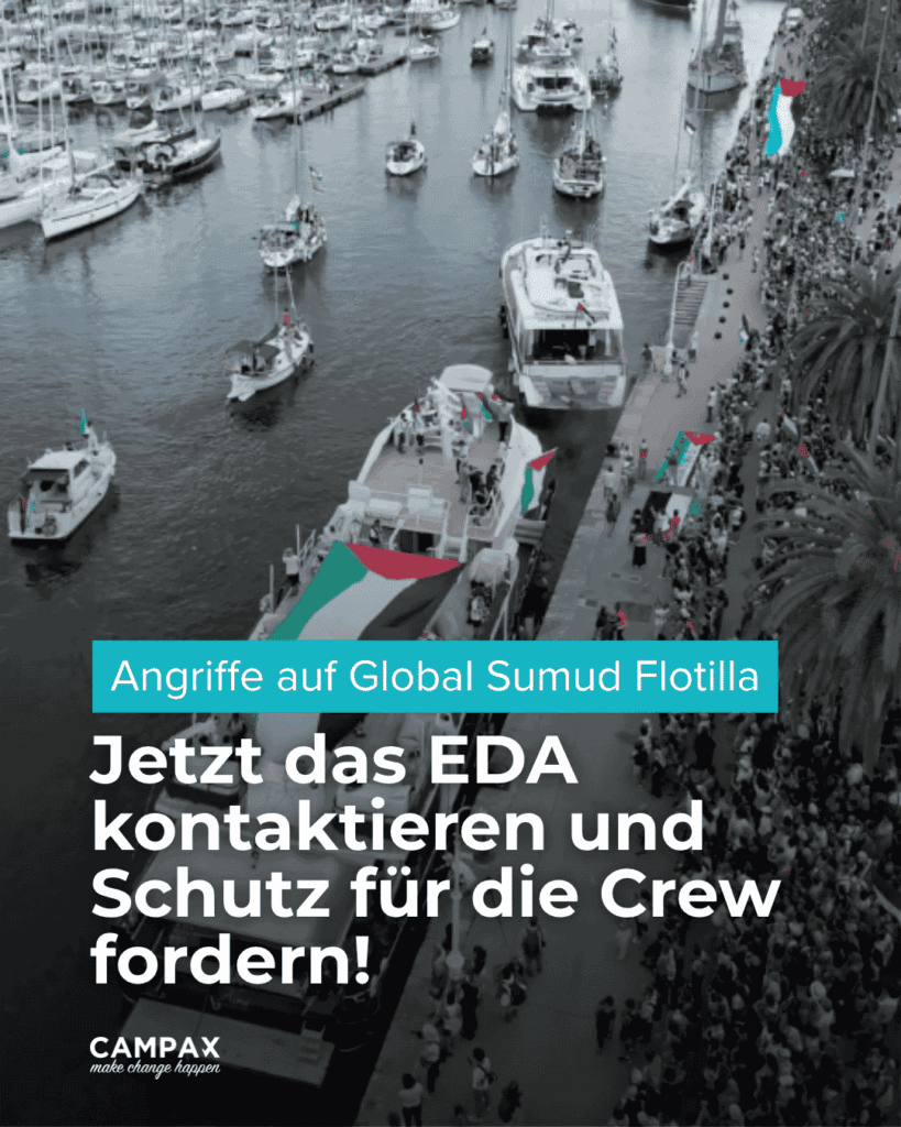 Schiffe der Global Sumud Flotilla wurden illegal gestoppt – schreibe jetzt dem EDA! In der Nacht von Mittwoch auf Donnerstag hat die israelische Marine Teile der Global Sumud Flotilla mit schwer bewaffneten Soldat*innen in internationalen Gewässern gestoppt. Unter den festgesetzten Helfer*innen befinden sich auch Schweizer Staatsbürger*innen: Lionel, Marc, Stéphane, Jeremy, Mehmed und Rahim. Dieses Vorgehen […]