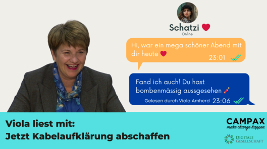 Gemeinsam mit der Digitalen Gesellschaft lancierten wir die Petition „Viola liest mit: Jetzt Kabelaufklärung abschaffen!“ im Januar 2024.