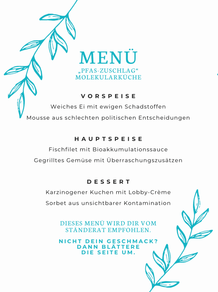 Eine Petition gegen einen Antrag, der vorschlug, stark mit PFAS kontaminierte Lebensmittel mit anderen, weniger betroffenen Lebensmitteln zu mischen, wurde dem Nationalrat im August 2025 mit einer Inszenierung eines giftigen Restaurants vorgelegt.
