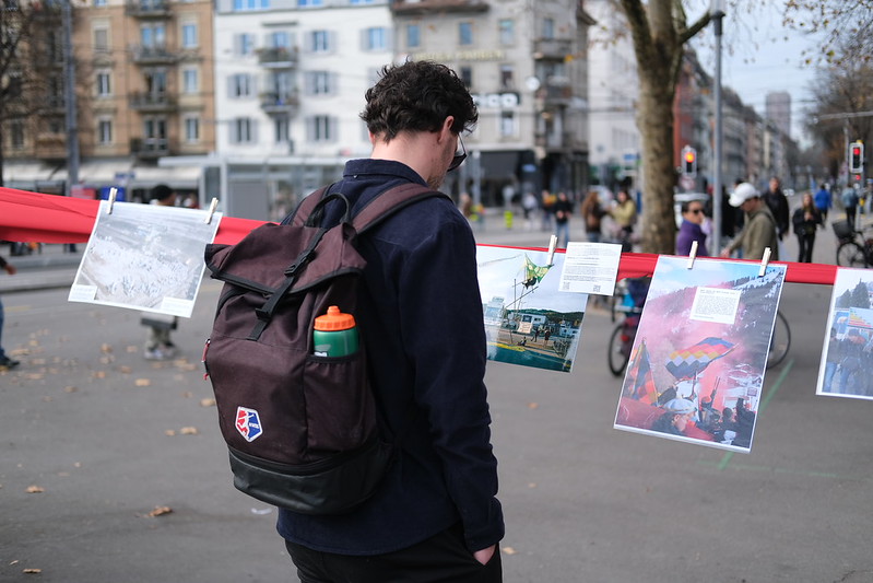 Samedi dernier, on se serait plutôt cru en été qu’à la mi-novembre. Une journée beaucoup trop chaude, qui nous a rappelé une fois de plus l’urgence du changement climatique. Et pourtant, le soleil a eu un effet positif : de nombreuses personnes sont venues visiter notre exposition éphémère à Zurich. Entre les images de protestations, de mouvements sociaux et de luttes de résistance à travers le monde, un lieu vivant d’échange et de solidarité a vu le jour.