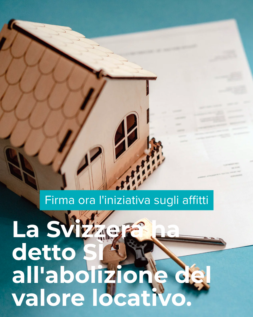 la Svizzera ha detto SÌ all’abolizione del valore locativo. Per questo, con l’iniziativa sui canoni di locazione, chiediamo che gli affitti vengano finalmente rivisti e adeguati. Con la tua firma fai la differenza: sostieni milioni di inquilini/e che già oggi lottano ogni mese per pagare l’affitto e chiedi che l’alloggio rimanga accessibile.